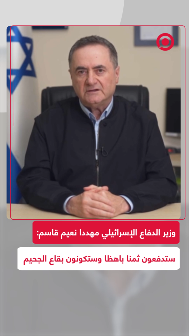 Play/Pause Mute/Unmute وزير الدفاع الإسرائيلي مهددا نعيم قاسم: ستدفعون ثمنا باهظا وستكونون في قاع الجحيم Save post Share Facebook X VK.com Telegram