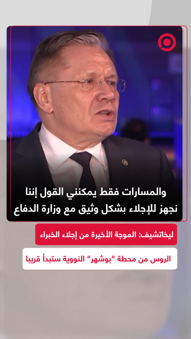 Play/Pause Mute/Unmute ليخاتشيف: الموجة الأخيرة من إجلاء الخبراء الروس من محطة بوشهر النووية ستبدأ قريبا Save post Share Facebook X VK.com Telegram